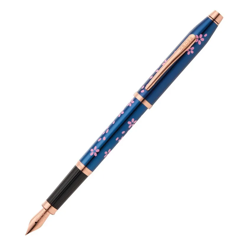 The Cherry Blossom Translucent Blue Lacquer with Rose-Gold Trim Fountain Pen – Medium Nib captures the serene beauty of cherry blossoms against a clear blue sky. Finished in rich translucent blue lacquer, the pen reveals depth and brilliance while maintaining a sophisticated, modern aesthetic.